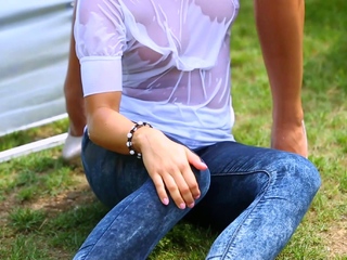 Horny lesbian having a golden shower under the sun