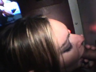 Provocative blonde nympho kneels down and chokes on gloryhole sticks